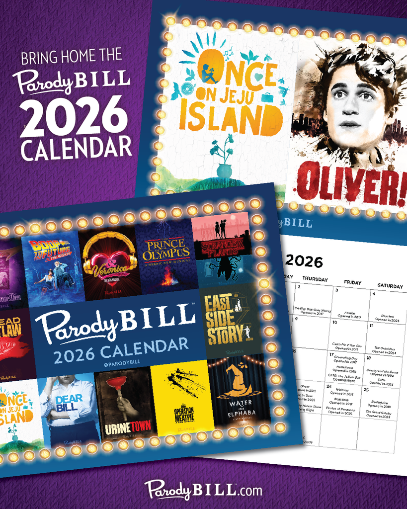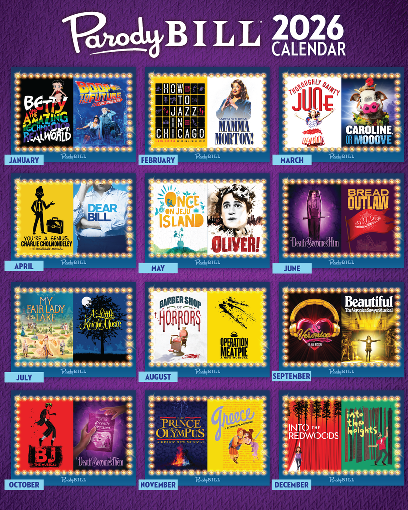 When you bring home the 2026 Parodybill Calendar, you get the gift of clever Broadway Parodies all year long! This 13-month wall calendar takes you all the way through January 2027.